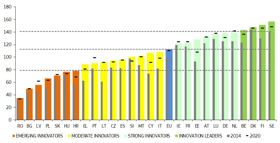 - Il punteggio dell'UE in termini di innovazione è aumentato in media di 12,5 punti percentuali dal 2014. Il maggior incremento si è registrato a Cipro, in Estonia, Grecia, Italia e Lituania.